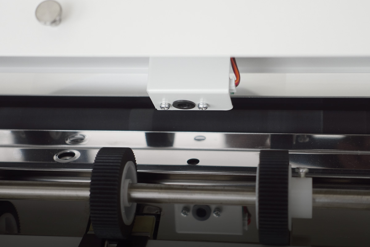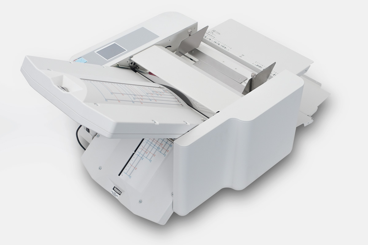 "*The fastest folding machine in its class! *Easy to use via touchscreen. *All settings of the folding machine are quick and easy to enter. *Selection of six different folds with automatic adjustment (folding settings are accessed electrically). *Automatic recognition for six DIN formats (A3, B4, A4, B5, A5, B6) *Memory function for 36 automatic folding positions that can be called up at the push of a button (6 folding types x 6 paper sizes) *Folding speed can be set variably *Folding performance 1800-14400 sheets/hour (with single fold A4) *Fold-down paper feed table with adjustable side guides for up to 500 sheets of paper *Two additional side supports with guide rollers for large paper formats *Paper feed system with three rubber rollers *Paper eject system with 3-way adjustable rollers *LCD display with four digit counter (total counter or preset counter) *If desired, a proof fold can be selected for pre-test on both sides of the paper. *Automatic switch-off when opening the movable parts. *Automatic switch with optical and acoustic signal. *Automatic error and paper jam notification with detailed description on the touchscreen. *Quick release folding rollers facilitate regular maintenance and cleaning. *Fold types: single fold, wrap fold, zigzag fold, window fold, double parallel fold, Z fold. Colour: light grey. *Suitable for paper size B7-A3. *Paper grades 50-160g/m2. *Capacity up to 14,400 sheets of paper. *Dimensions when closed (H x W x D): 480 x 650 x 545 mm. *In-use size (H x W x D): 510 x 1,020 x 545mm. *Sound level 79 dB. * Mains voltage 230V/50Hz. *Weight 29.5kg."