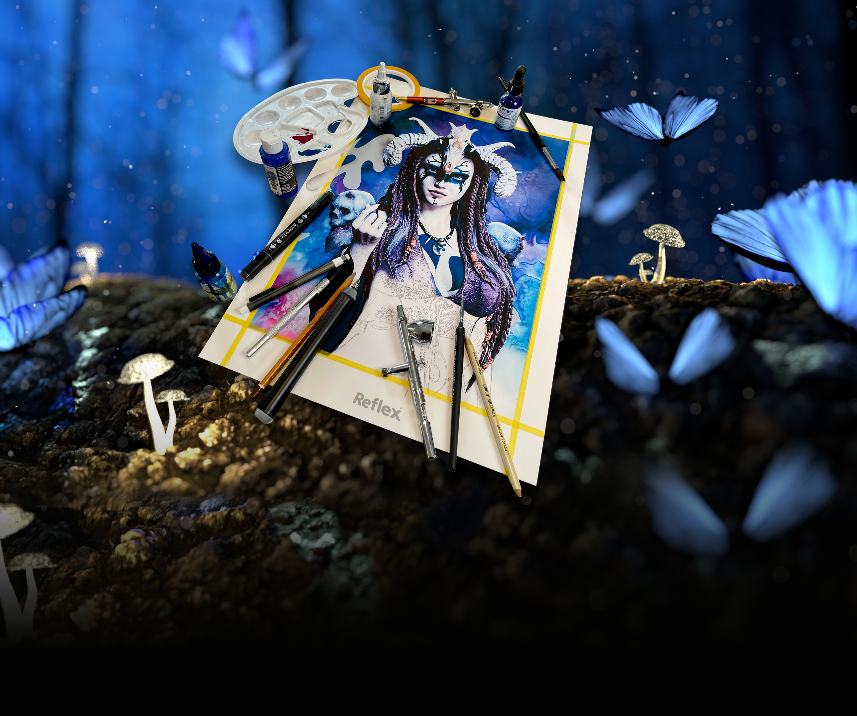 The new quality artist drawing carton “Reflex Artboard“ is even purer and whiter than its predecessor “Schoellershammer 4G “. It is optically and in terms of "feel" even more noble and has its front and back processed in an identical way. “Reflex Artboard” is very suitable for gumming techniques. Scraping away paint with a scalpel also works clearly better on "Reflex Artboard" than with other cardboard qualities, without damaging the surface. People who like to work with airbrush masking film and other special tapes will have a lot of fun with “Reflex Artboard”. The surface remains stable and does not fibre. Cut edges are less visible than with other cardboard qualities. The artist's carton "Reflex Art Board" has been specially developed for airbrush artists and is therefore ideal for processing with airbrush acrylic paints. Compared to other drawing and painting surfaces, "Reflex Artboard" is also suitable for watercolor techniques and processing with acrylic, tempera, ink, gouache and oil paint. Acrylic can remain workable ("wet") for days with Retarder ("retarder"), without the "Reflex Artboard" cardboard waving or changing in size.