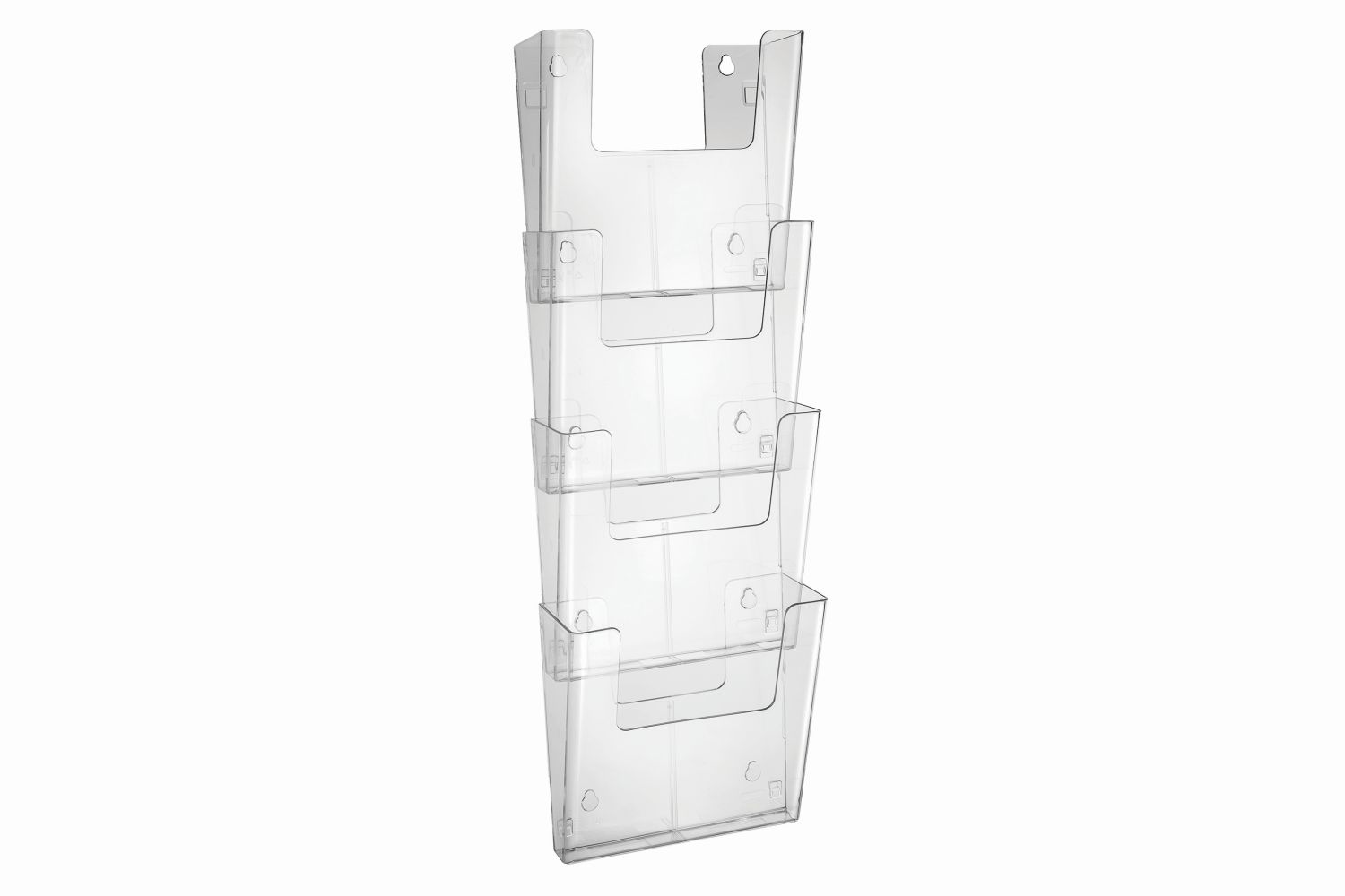 Europel Crystal Clear recyclable polystyrene Wall Mounted Brochure holder in Portrait form. Four Tier Wall mounted dispenser A4 Leaflets and Brochures. Portrait. Connectable by innovative Coupling system. Underneath and adjacent to each other expandable. Inner sizes 226x90/36x230 mm. Material: Crystal Clear recyclable polystyrene. Model: Portrait.