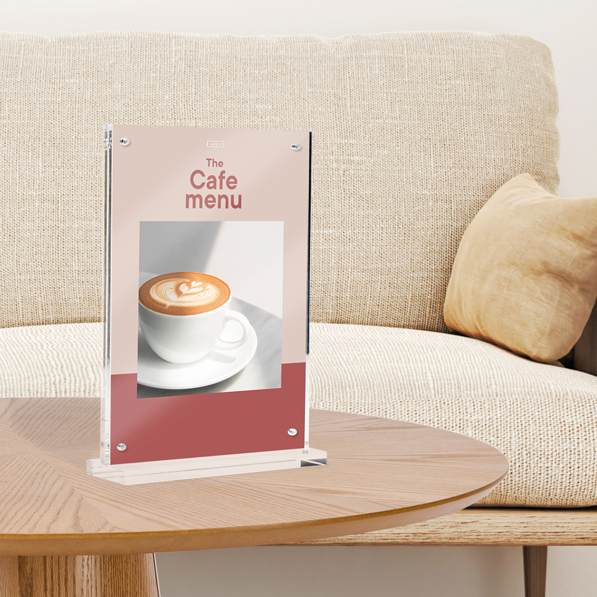 Luxurious acrylic sign holder with magnets and a sturdy base for a representative 2-sided presentation. Suitable for A5 format. 10 mm thick.
