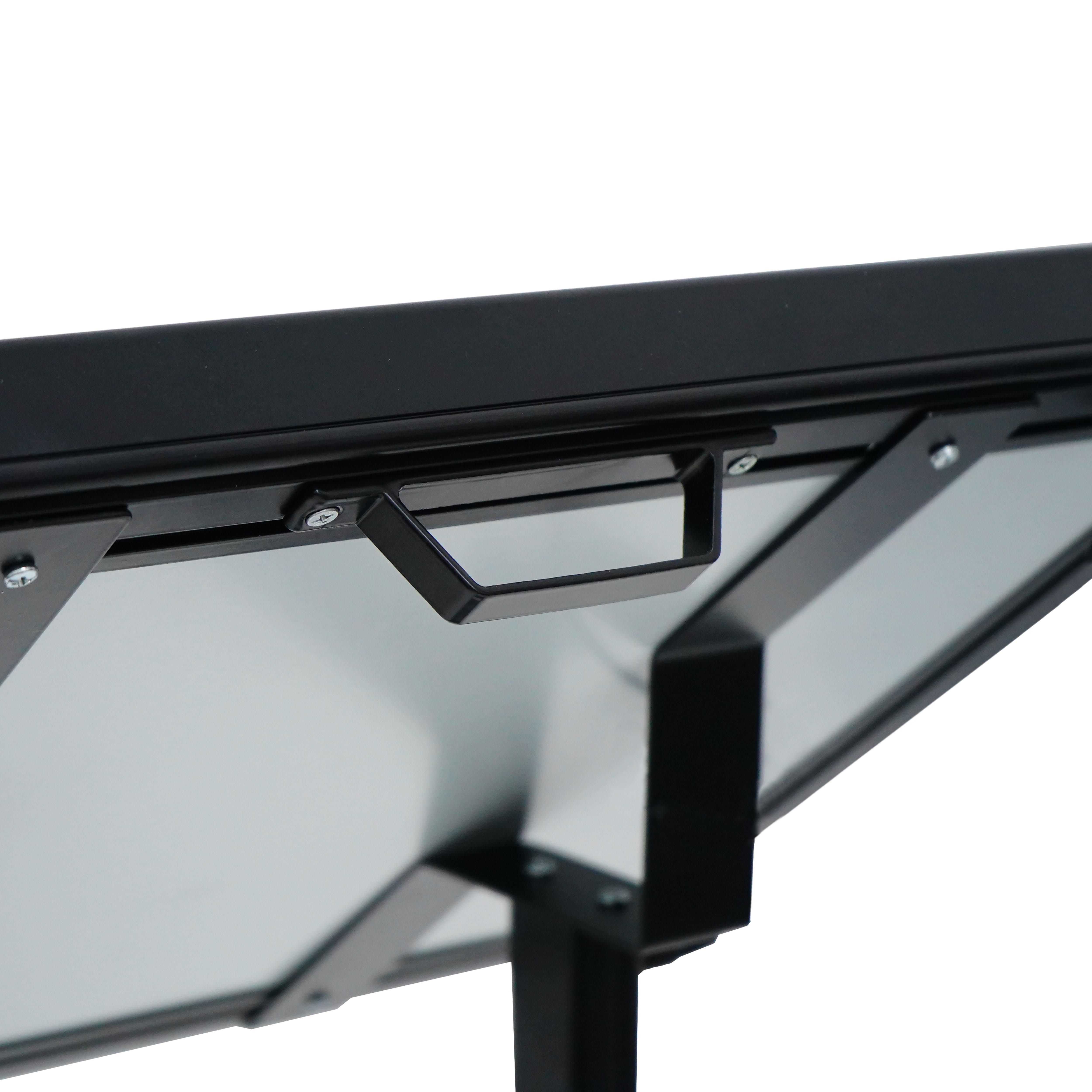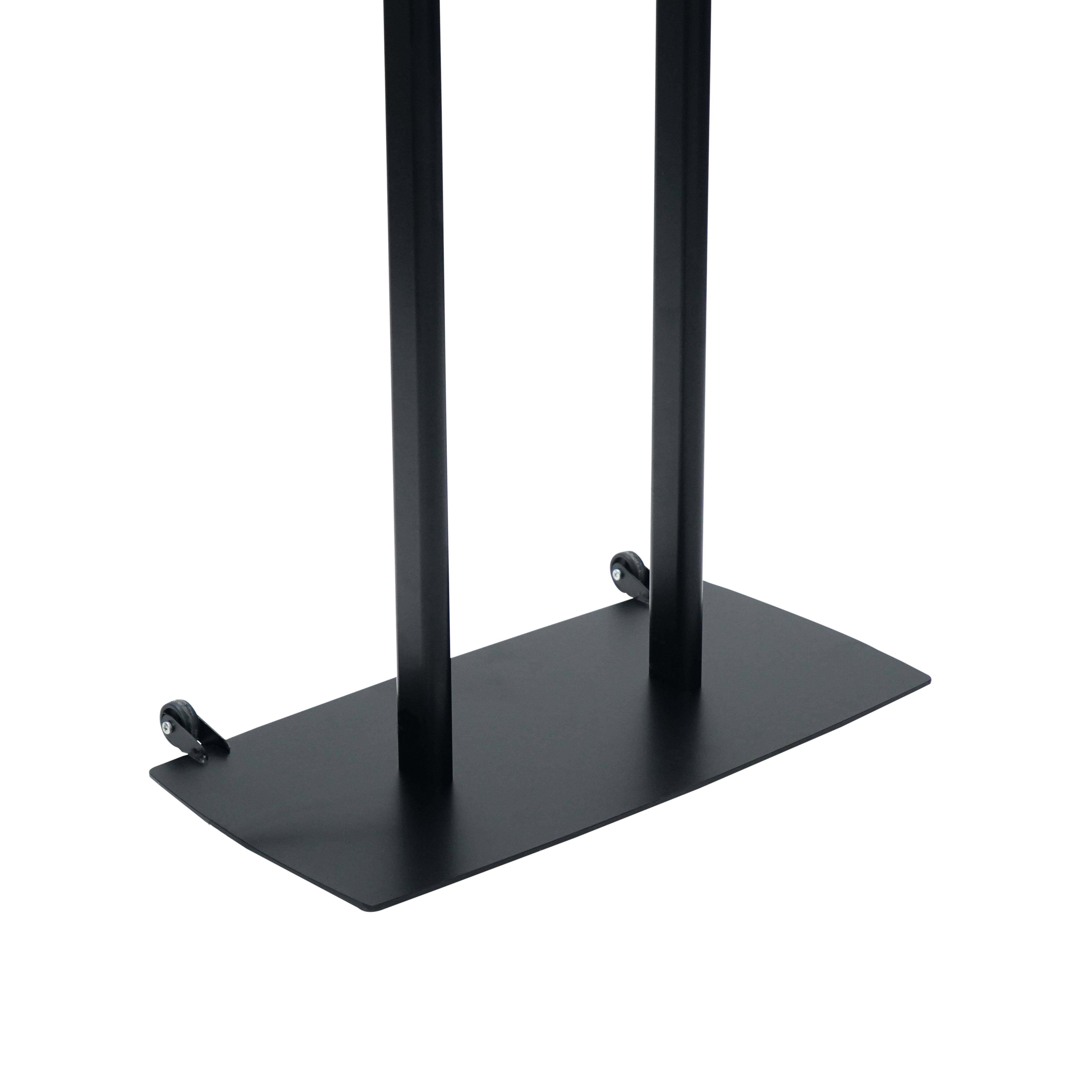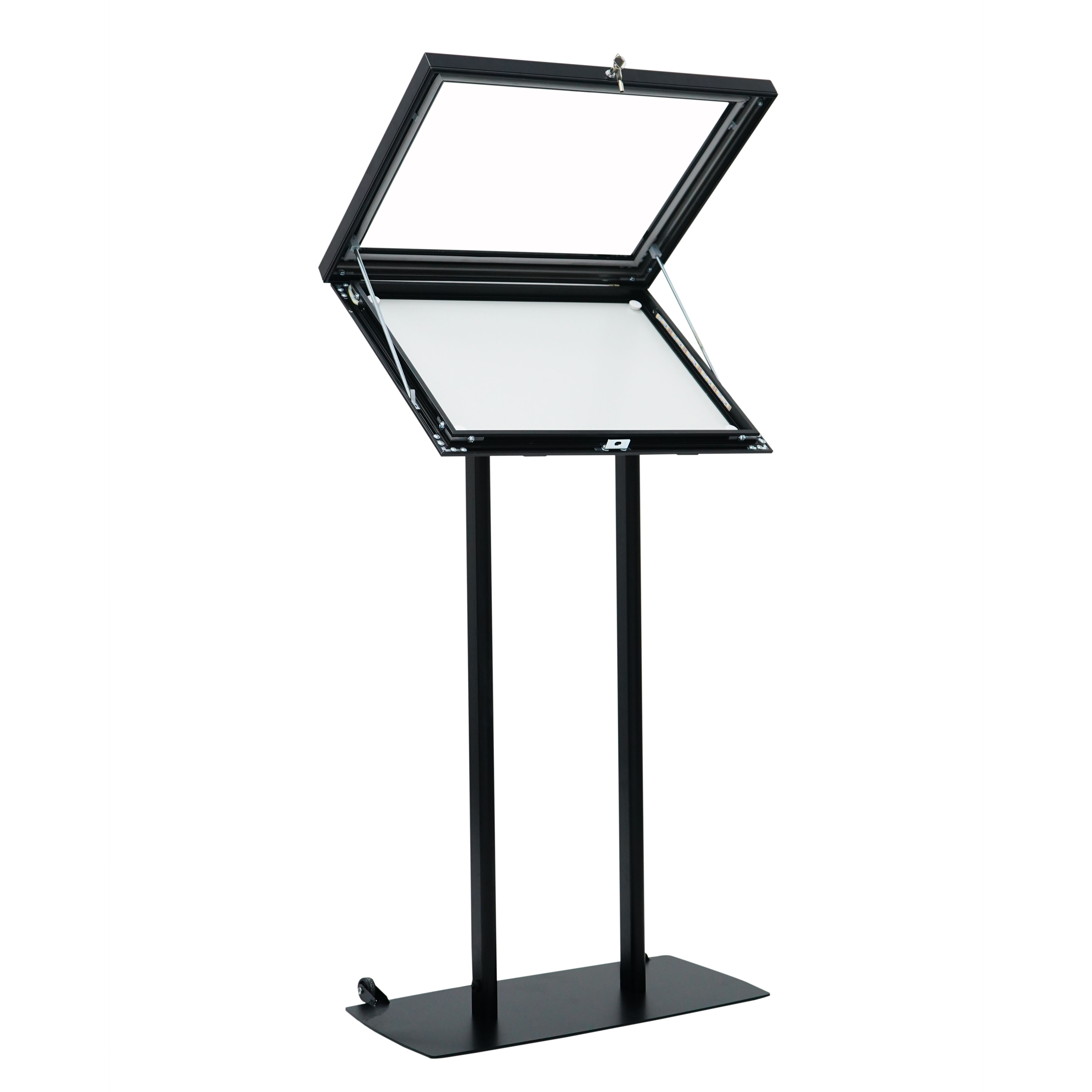 Sturdy metal display cabinet on a standard for placing menus. Size 2x A4 . Lockable with key. Suitable for outdoor use. Easy to move thanks to 2 wheels at the back. Display case dimensions: interior (visible) 480x430mm, exterior 558x418mm. Profile width 35mm, depth 38mm. Total height 1114mm.