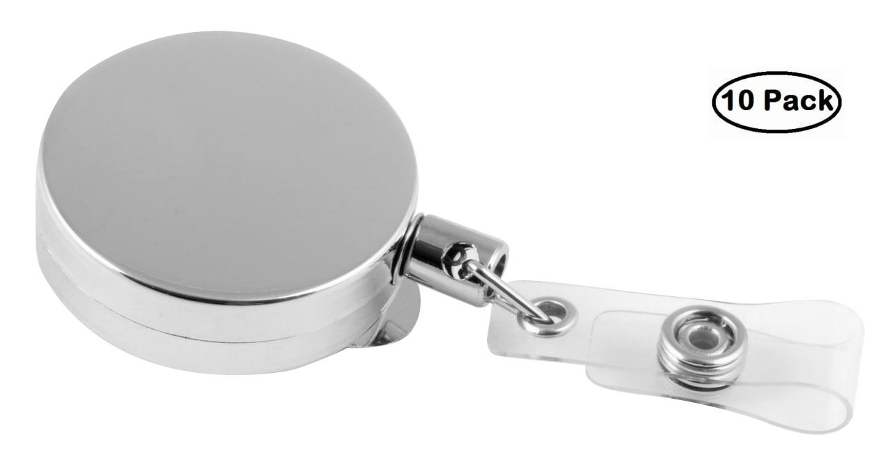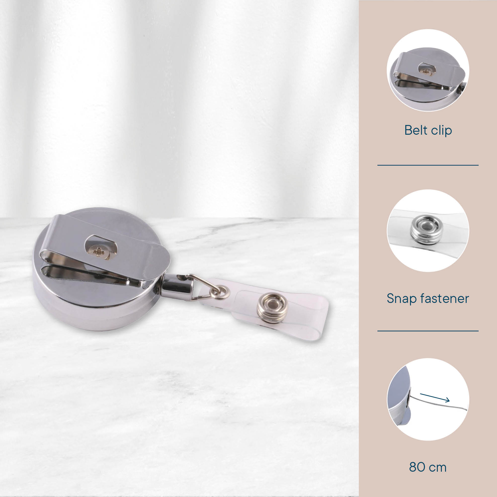 *Badge reel for badge and pass holders. *Solid metal construction. *Plastic fastening strip with push button. *Metal clamp at the rear. *Length cord 80cm. *Colour black. * Packed per 10 pieces.