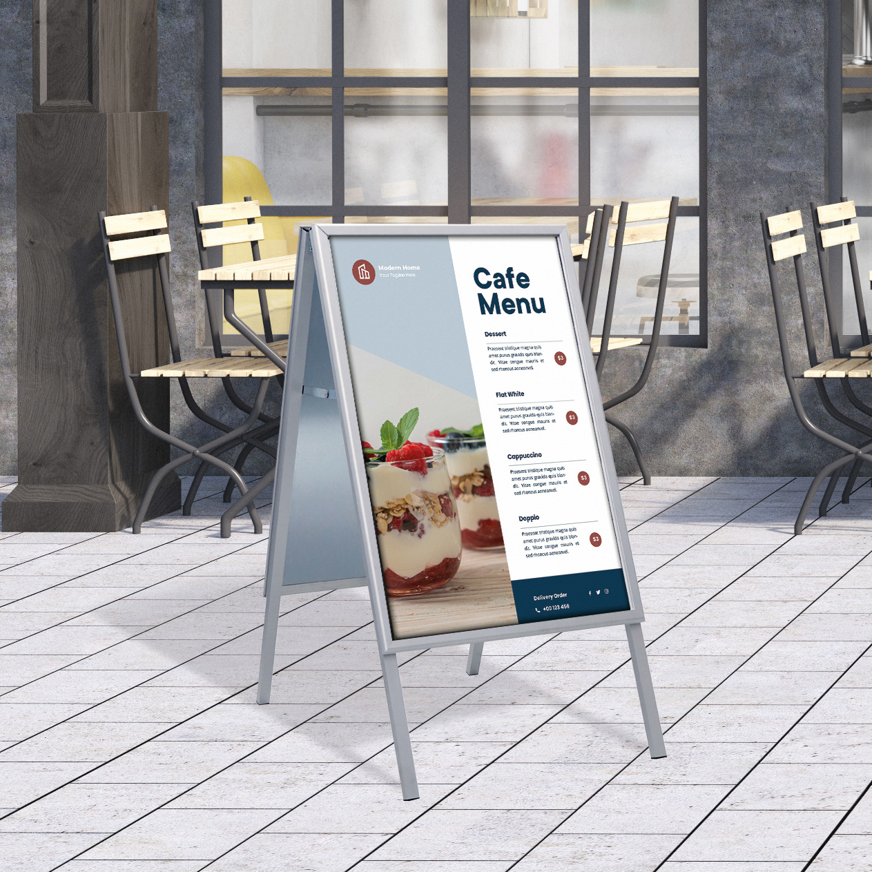 Pavement sign A-Frame with 32mm profile snap frame. Top quality snap frame of anodised aluminium with mitred corners, galvanized steel backplate and clear anti-glare front cover sheet. Suitable for B1 paper size. Double sided presentation. Weather resistant with rubber foam around the frame and water discharge holes on the bottom.