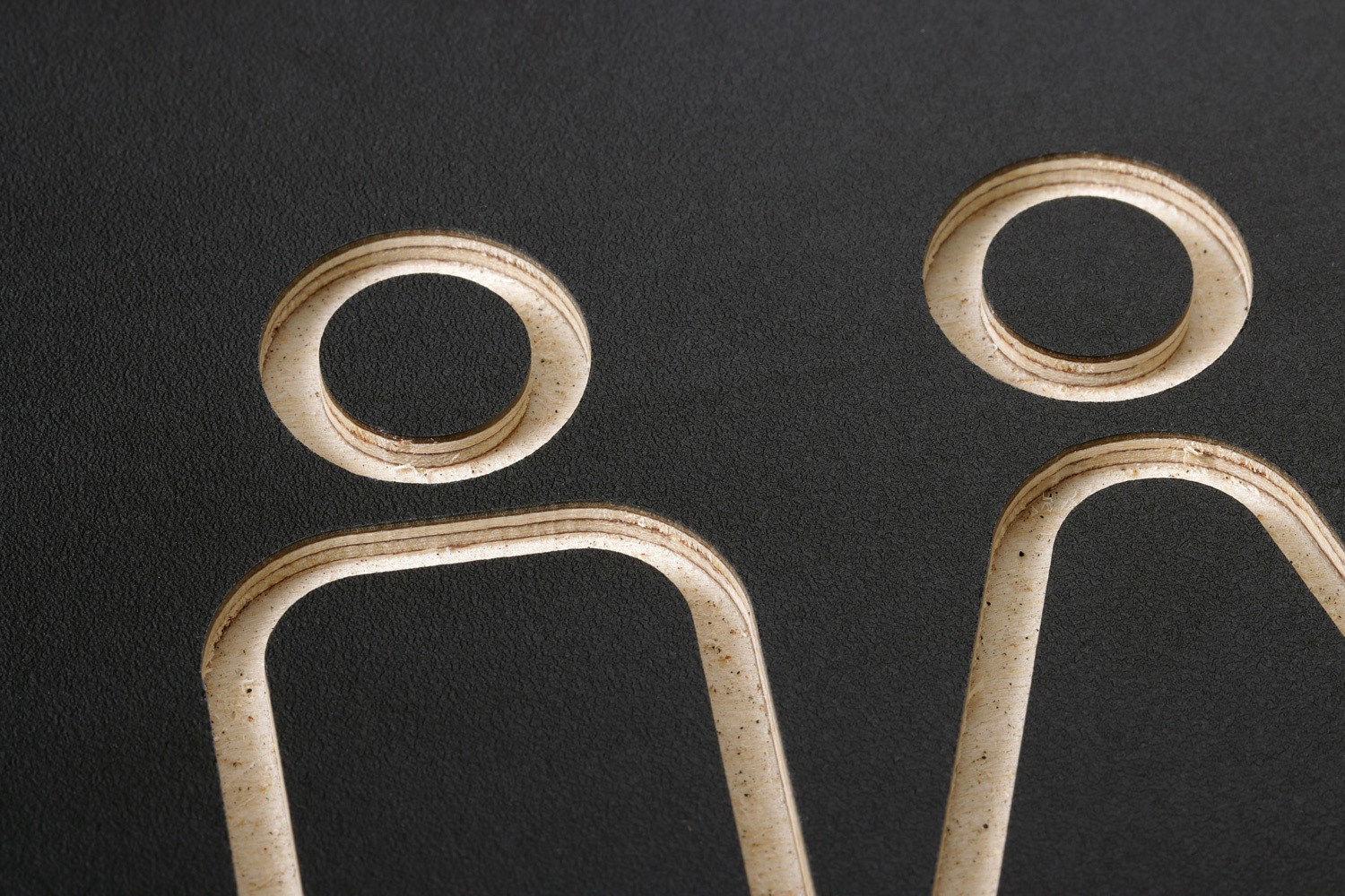 Stylish self adhesive "Man/Woman" office and hospitality icon. Milled on one side from high-quality plywood with a black surface. Dimensions height x width x thickness 10,5x15x0,80 cm.