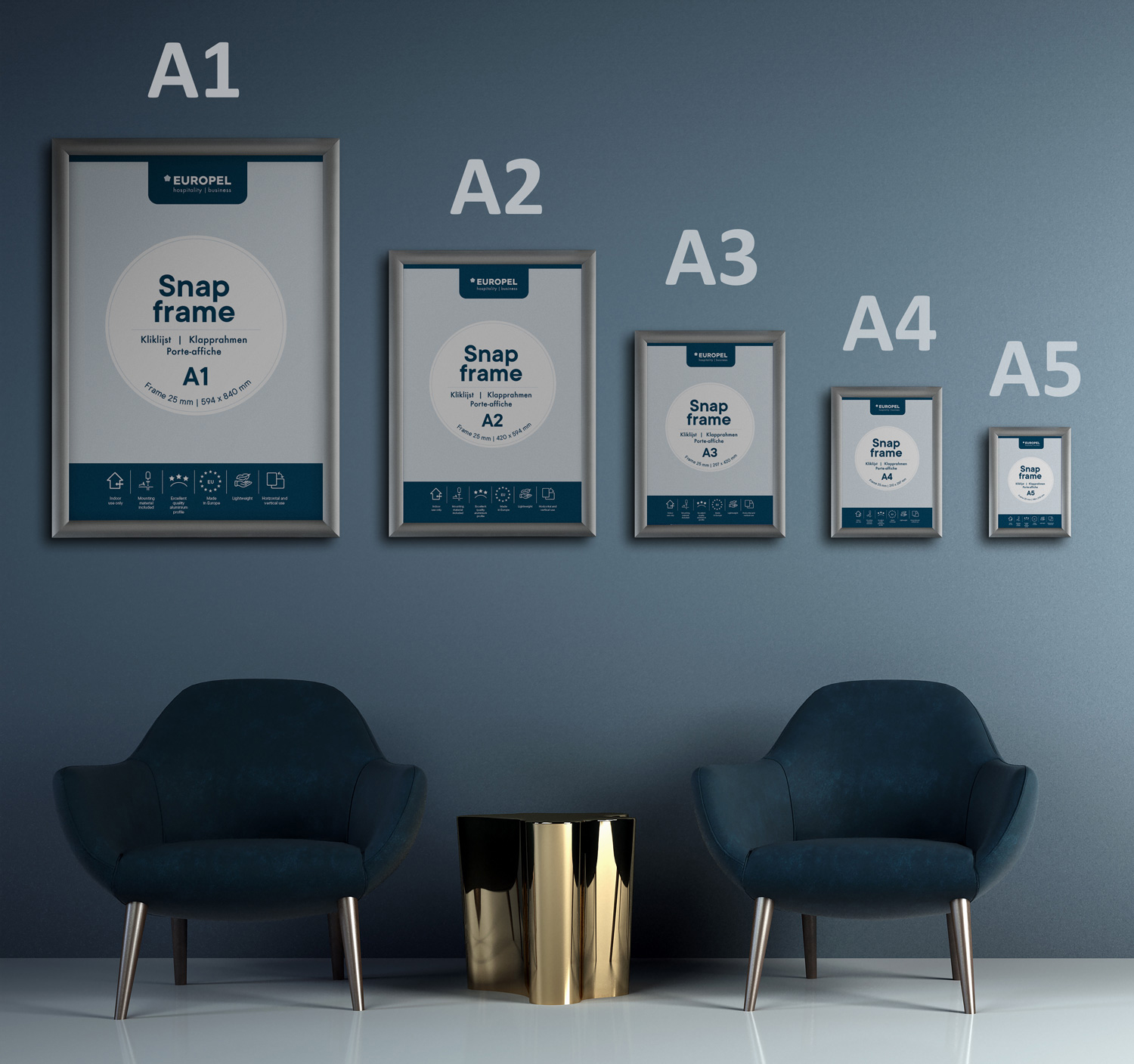 Top quality snap frame with Easy-Click system for fast, easy and representative presentation. Anodized 25mm aluminum profile with mitred corners and polypropylene backside. The anti-glare clear cover sheet (PET) protects the poster from dirt and moisture. Wall mounting kit is included. Suitable for A2 size posters.