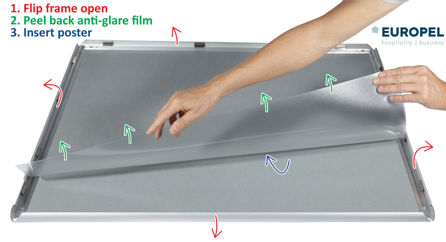 * Top quality Snap Frame with Easy-Click system for a quick, simple and representative presentation. * Made of anodized aluminum with plastic backing. * The clear transparent anti-reflective cover film (PET) protects the poster against dirt and moisture. * 25mm profile with mitres corner. * Mounting material is included. * Suitable for A3 paper size. * Due to the red-colored frame, this Snap Frame is perfectly suitable for escape routes, safety rules, etc.