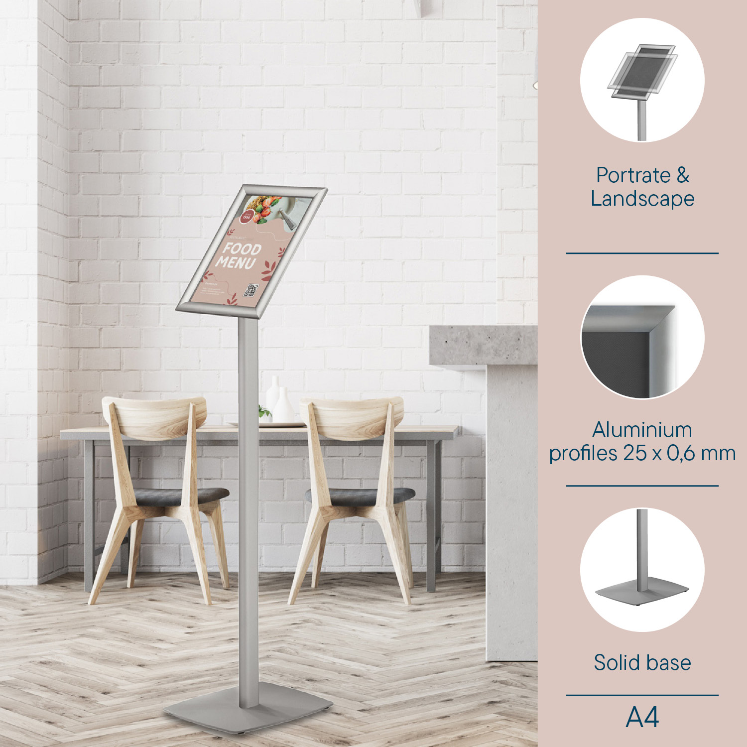 Classic design infostand including A4 format mitred corner snap frame (355001) with Easy-Click system for a quick, simple and representative presentation. Snap frame of anodised aluminum with plastic back. The clear transparent anti-reflective film (PET) protects the poster against dirt and moisture. Stand is easy to assemble. The snap frame can be positionned both in portrait and landscape. Base 320x245 mm is made of 4 mm steel. Height of stand 900 mm. Height including snap frame A4 portrait 1100 mm. Snap frame mounted at an angle of 38º. Colour: Grey.