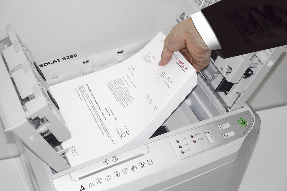 Paper Shredder IDEAL Shredcat 8280 CC 4x10 mm. Compact auto-feed office shredder with automatic feed of up to 150 sheets of paper. Separate carving for CD-DVD destruction. Patented auto-feed system for automatic feeding of paper stacks up to 150 sheets (DIN A4, 80 gsm). Manual feed up to 6 sheets at once. Clear control panel with LED light indication for control options and push buttons for position, stop and return. Automatic start and stop indication by light eye protection. Automatic power off in EcoMode mode. Low-noise, powerful and energy-efficient motor. Separate cutting for CDs/DVDs/credit cards. Safe use of the paper shredder through an extensive safety package. Removable paper collector with large viewing window as filling indicator and automatic switch-off for safe emptying of the collector. Container capacity: 30 litres. Separate collection tray for CDs/DVDs/credit cards. Equipped with castor wheels. Manufactured in China to Ideal quality specifications. 2 year warranty on all parts. Dimensions (HxWxD): 520 x 444 x 360 mm, weight 14.5 kg. DIN 66399 Safety level P4.