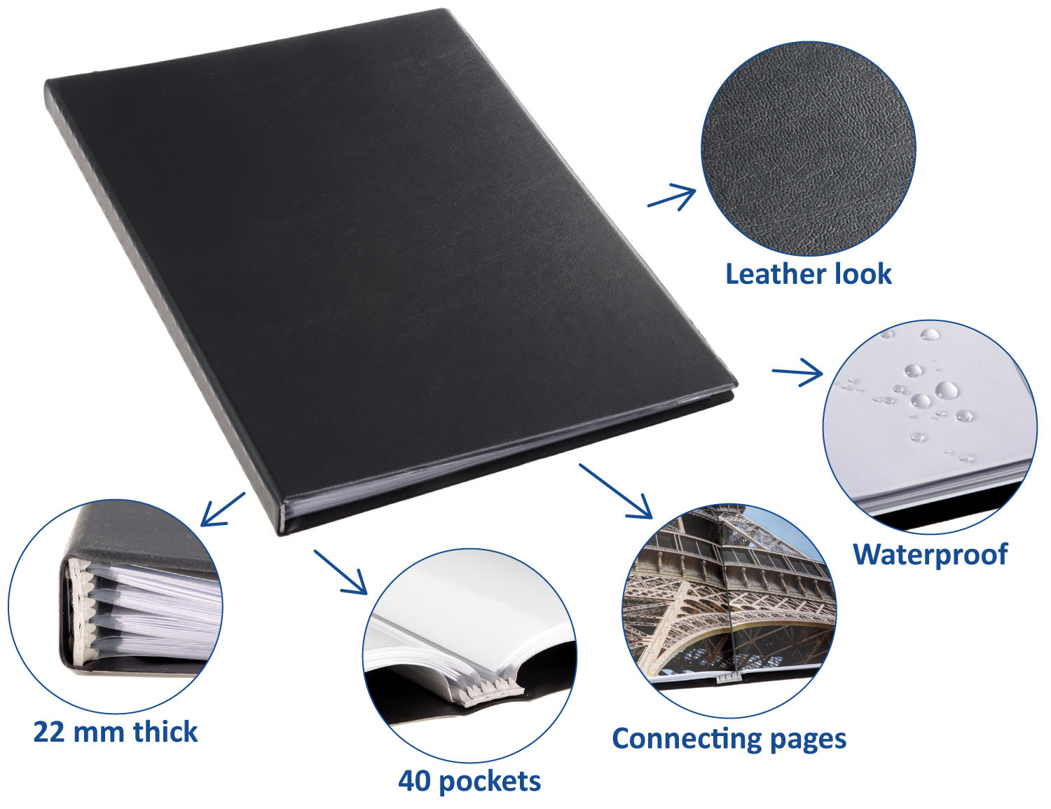 Rillstab display book A4 original made of grained plastic material. Inside, is the Rillstab mechanism, with 40 internal pockets = 80 x A4 size made from acid-free polypropylene. The internal pockets are made of polypropylene material, glass clear, non-reflecting, thickness 50 mu. On the right inside vertical insert on full height. Colour black. Space and weight-saving compared to other presentation maps and ring binders. Turn over the pages like a book.